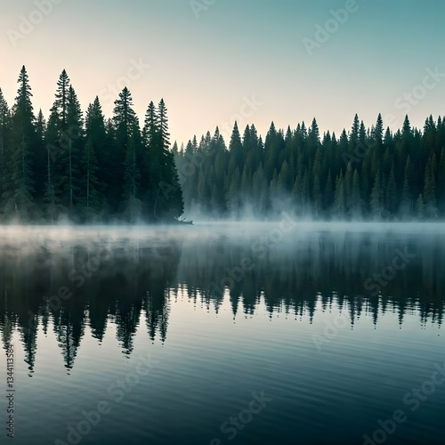A serene early morning fog over a calm lake, with mist hovering over the water, and tall trees reflected in the still surface, Ai Generated