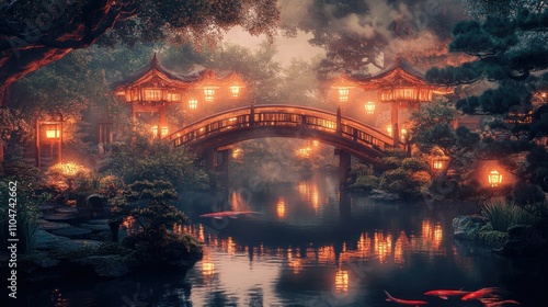 bridge, lantern, duck pond, koi, tree, water, garden, architecture, evening, nature, calmness, culture, landscape, light, peaceful, scenery, traditional, serene, outdoors, dusk, beauty, harmony, plant, foliage, illumination, wildlife, zen, calm, aesthetic, artistic, environment, scenic, atmosphere, design, travel, art, photo, spirituality, relaxation, exploration, history, heritage, ambience, craftsmanship, elegance, colours, shadow