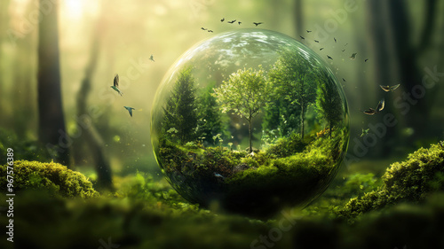 A serene forest microcosm features tiny birds flying between lush greenery and vibrant trees within glass sphere, creating magical atmosphere of natures beauty