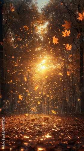 A serene forest scene with falling autumn leaves illuminated by warm sunlight.