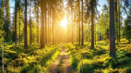 A serene forest scene with sunlight filtering through tall trees, illuminating a peaceful path.