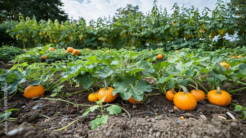 A serene garden with a pumpkin vine spreading across the ground, showcasing several large pumpkins in different stages of ripeness