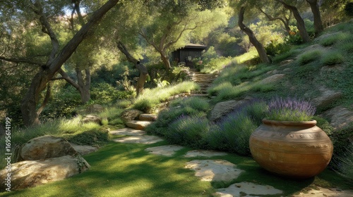 garden, greenery, nature, outdoors, landscape, landscaping, serene, escape, harmony, calmness, peaceful, retreat, step, shadow, shade, ornamental, relaxation, path, lush, tranquil, backyard, plant, shed, hillside, calm, timberland, bungalow, design, decorative, sunlight, meadow, pot, tree, clay, scenic, grass, leaf, earthenware, foliage, moss, environment, rustic, natural, flora, stone, countryside, botany