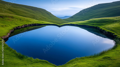 A serene heart-shaped lake surrounded by lush green hills, evoking tranquility and nature.
