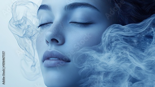 a serene image depicting a partial view of a persons face in a state of mindfulness meditation seamlessly blended,tranquil wave patterns symbolizing peace and mental clarity.stock image