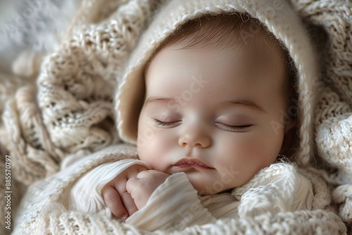 A serene image of a newborn baby peacefully sleeping, wrapped in a soft white blanket