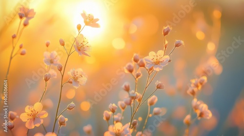 A serene image of delicate flowers bathed in warm sunlight, creating a dreamy atmosphere filled with soft colors and bokeh effects.