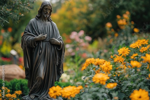 A Serene Jesus Statue Surrounded by a Lush Garden of Colorful Flowers for Peaceful Reflection