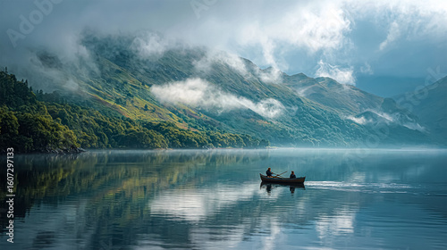 A serene lake surrounded by misty, forested hills, with two people rowing a small boat across the calm waters. The reflection of the landscape on the lake creates a peaceful and tranquil scene.