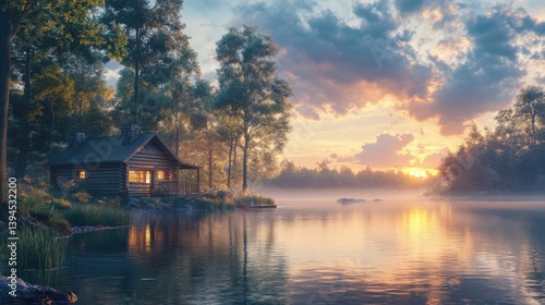 A serene lakeside cabin surrounded by trees, reflecting on calm waters as the sun sets, creating a picturesque and tranquil atmosphere.
