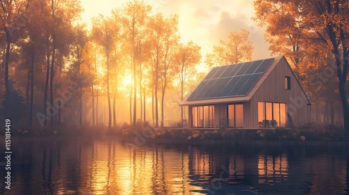 house, lake, tree, sunset, solar, nature, autumn, peaceful, architecture, design, environment, landscape, water, light, warmth, calmness, wood, rural, modern, energy, sustainable, beauty, scenery, harmony, forest, home, sky, foliage, colours, evening, serene, stillness, relaxation, environmentally friendly, lifestyle, retreat, cosy, picturesque, escape, cloud, sunlight, view, calm, atmosphere, innovation