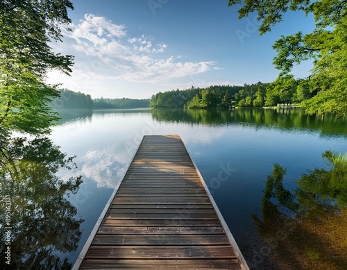 A serene lakeside scene with a wooden dock extending into the calm water, surrounded by lush