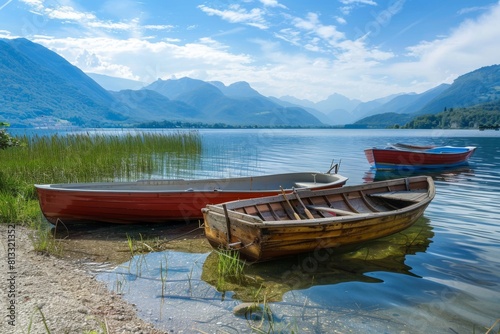 A serene lakeside scene with boats gently bobbing on the water