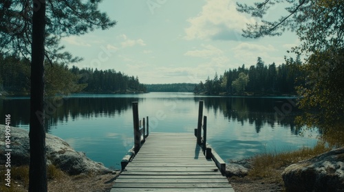 lake, dock, water, tree, sky, cloud, nature, calmness, landscape, serene, peaceful, wood, shore, scenic, environment, calm, summer, blue, green, rock, horizon, sunlight, wilderness, travel, explore, adventure, escape, relaxation, beauty, scenery, wildlife, hiking, fishing, boating, leisure, photo, panorama, retreat, vista, atmosphere, freshness, stillness, natural