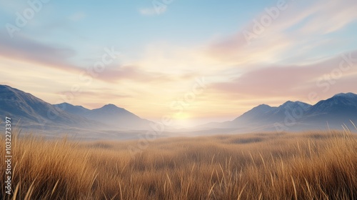 A serene landscape at sunrise, featuring rolling hills, misty fields, and a colorful sky, evoking tranquility and the beauty of nature.