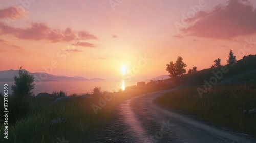 A serene landscape at sunset, featuring a winding road by the water and gentle hills.
