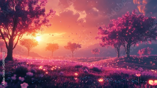 A serene landscape at sunset featuring vibrant pink trees and flowers, with a stunning sky illuminated by warm hues, creating a tranquil atmosphere ideal for relaxation and nature appreciation