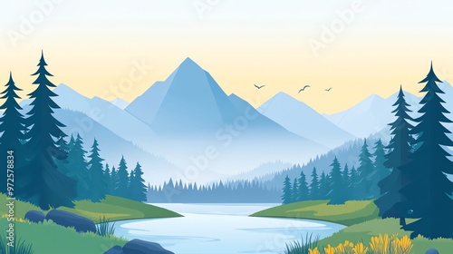 wallpaper, mountain, river, forest, nature, landscape, scenic, outdoors, tree, water, sky, vale, green, illustration, view, beautiful, peace, serene, calm, tranquil, peaceful, harmony, art, sunset, dawn, morning, evening
