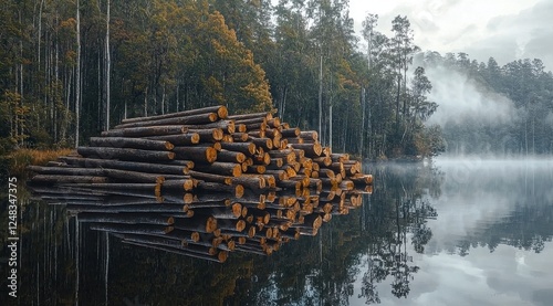 A serene landscape featuring a stack of logs by a misty lake, surrounded by lush trees, reflecting nature's tranquility.