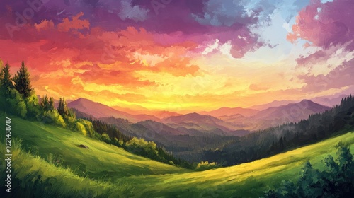 A serene landscape featuring rolling hills and a vibrant sunset creating a tranquil and picturesque scenery