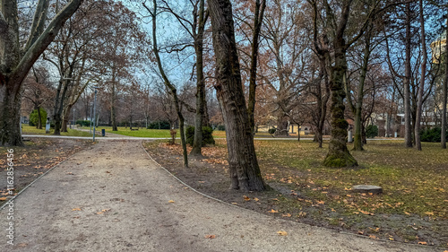 A serene, leaf-strewn park pathway on a cloudy autumn day, capturing the essence of fall solitude and reflection