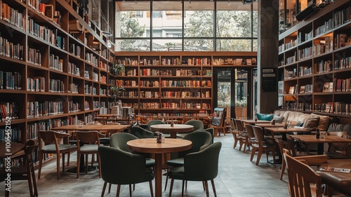 A serene library interior featuring wooden shelves, cozy seating, and natural light, perfect for reading and study.