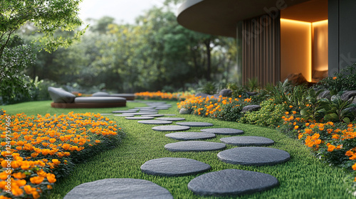 A serene minimalist house with a small, lush garden. The yard features colorful flowers and a stone path, offering a bright modern tone, with blurred space for captions on the side