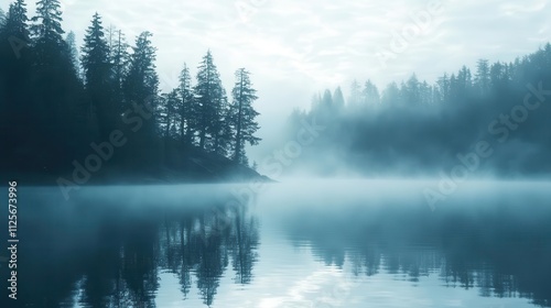 A serene misty lake surrounded by tall trees, reflecting a calm atmosphere.