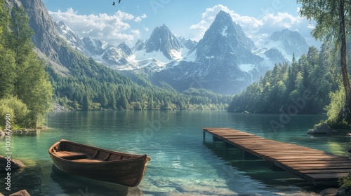 A serene mountain lake with clear water, a small boat, and a wooden dock, surrounded by lush green forests and snow-capped peaks under a blue sky.