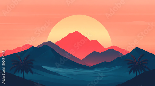 A serene mountain landscape with a vibrant sunset, featuring silhouettes of mountains and palm trees against a colorful sky.