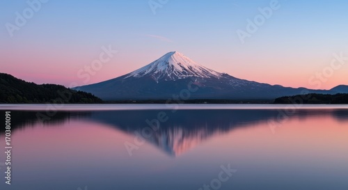A serene mountain peak, reflected perfectly in a tranquil lake, bathed in the soft hues of a peaceful dawn.