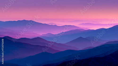 A serene mountain range at sunrise, layers of purple and pink hues blending in the sky