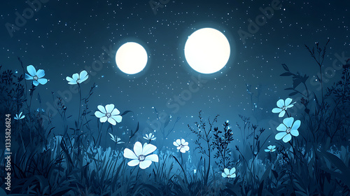 A serene night landscape featuring glowing flowers under a starry sky with two bright moons