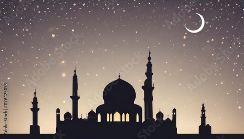 A serene night scene featuring a silhouette of a mosque against a gradient twilight sky. Ramadan Karrem Space Text