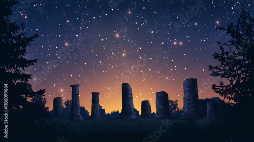 A serene night scene featuring ancient stone pillars under a starry sky at twilight.