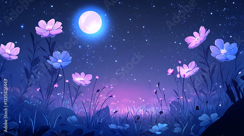 A serene night scene featuring blooming flowers under a bright moon with a starry sky backdrop