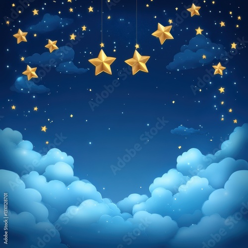 A serene night sky filled with hanging golden stars and fluffy clouds creates a whimsical atmosphere, This image is perfect for themes of dreams, magic, or children's literature,