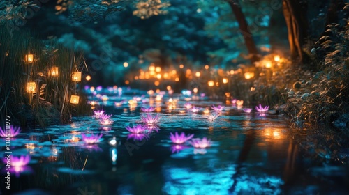 water, river, flower, lotus, illuminated, glowing, lantern, light, plant, reed, grass, forest, tree, night time, dark, blue, purple, orange, bright, scenic, nature, peaceful, calm, tranquil, serene, magical, fantasy, aethereal, dreamy, soft, artistic, scene, ambient, background, landscape, surface, floating, delicate, blossom, aquatic, depth, perspective, outdoors, natural, beauty, shimmer, spark