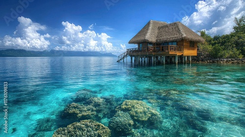 A serene overwater bungalow surrounded by clear turquoise waters and vibrant coral reefs.