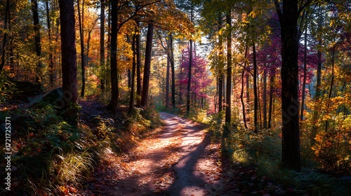 autumn, colourful, glow, tranquil, leaf, solitude, exploration, calmness, colours, serene, peaceful, foliage, nature, scenic, sunlight, wood, fall, forest, landscape, tree, path, vibrant, season, gold, orange, outdoors, yellow, trail, beauty, pathway, red, environment, shadow, winding, ground, hiking, dirt, light, warm, daylight, journey, road, beautiful, brown, countryside, natural, view, image, forestry