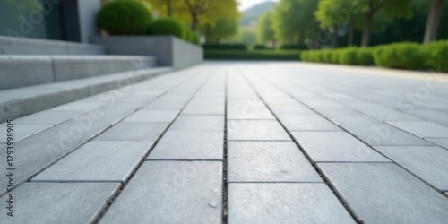 A Serene Pathway Light Gray Paving Stones Leading to a Tranquil Green Landscape with Steps and Lush Greenery