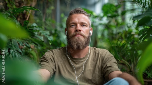 A serene portrait of a bearded man sitting comfortably among lush green plants, wearing headphones, representing relaxation and connection with nature.