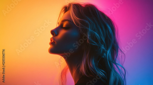 A serene profile of a woman illuminated by vibrant, colorful light, showcasing a blend of soft features and artistic ambiance.