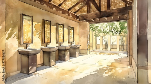 A serene restroom interior with natural light, featuring elegant sinks and a wooden ceiling, surrounded by greenery.