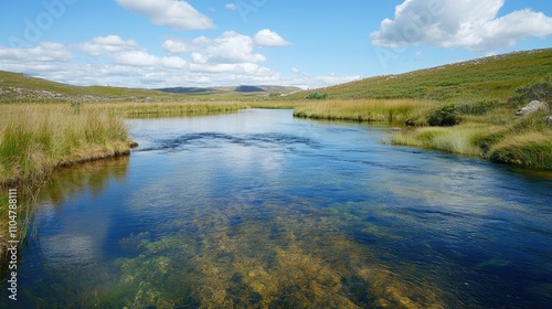 river, water, sky, cloud, hill, grass, nature, landscape, calmness, scenery, outdoors, environment, ecosystem, beauty, summer, sunlight, flora, fauna, wilderness, peaceful, clear, vibrant, rural, scenic, ripple, greenery, fresh, serene, calm, meadow, horizon, terrain, natural, blue, flowing, aquatic, biodiversity, weather, picturesque, tranquil, remote, open, expansive, inviting