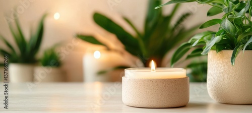 A serene scene featuring a lit candle beside lush green plants, creating a calming atmosphere with soft lighting.