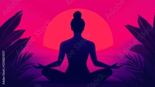 A serene silhouette of a woman meditating against a vibrant sunset backdrop, surrounded by lush foliage, representing tranquility and spiritual awakening.