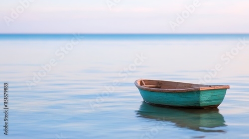 A serene, solitary boat floats on calm, tranquil waters under a soft sky, creating a peaceful and reflective scene.