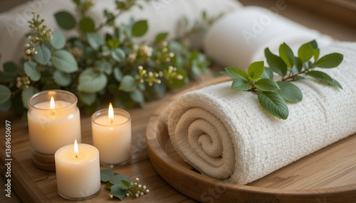 "A serene spa setup with candles, eucalyptus leaves, and a warm towel on a wooden tray."