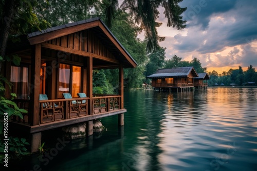 A serene summer evening at a lakeside resort featuring charming wooden bungalows nestled amidst lush greenery and a tranquil lake